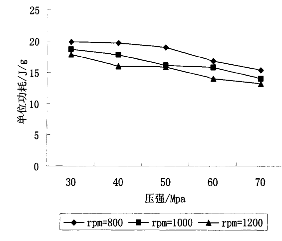 壓強和轉(zhuǎn)速對破碎產(chǎn)品單位能耗的影響